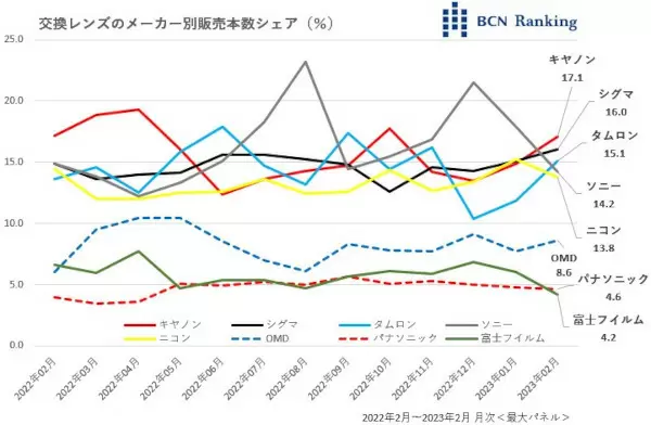 En février, Canon est en tête en termes de part des ventes unitaires, mais la bataille pour la part supérieure des objectifs interchangeables est entrée dans un état « 5 directions». Canon est suivi de Sigma, Tamron, Sony et Nikon. Les ventes d’objectifs interchangeables ont augmenté considérablement au cours de la dernière année, avec une croissance à deux chiffres pendant 16 mois consécutifs.